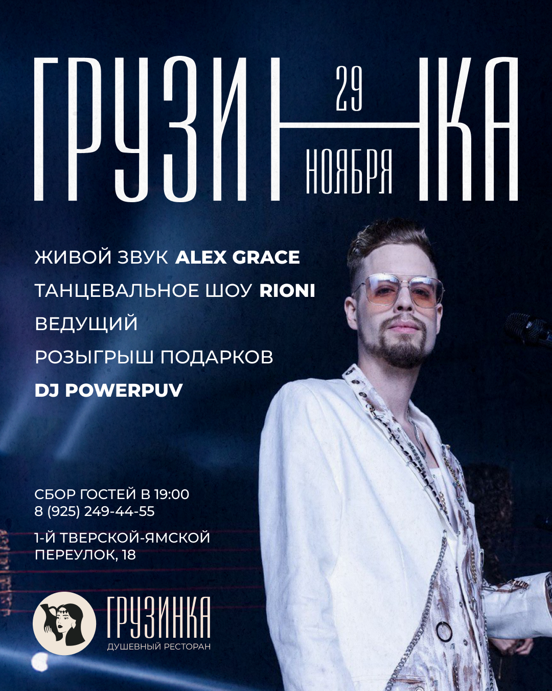 29 ноября приглашаем вас на субботний вечер, чтобы провести его ещё насыщеннее: выступление Alex Grace, зажигательное шоу RIONI, ведущий, розыгрыш подарков и музыка от DJ PowerPuv. Прекрасный повод собраться и красиво провести выходной.