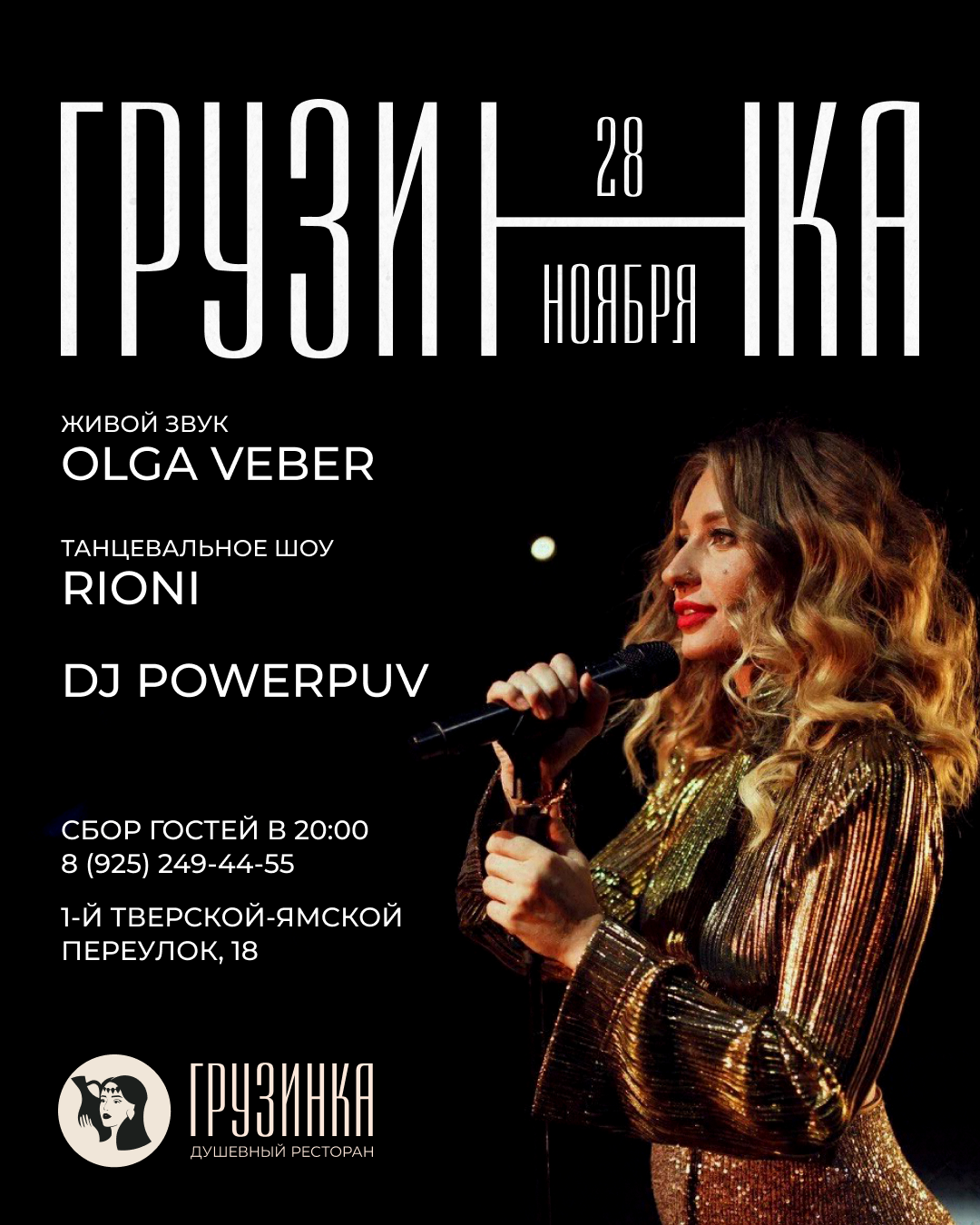 28 ноября приглашаем провести пятничный вечер в атмосфере «Грузинки» под живой вокал Olga Veber, яркое шоу RIONI и сеты от DJ PowerPuv. Это будет тёплая, музыкальная пятница с атмосферой начала выходных.